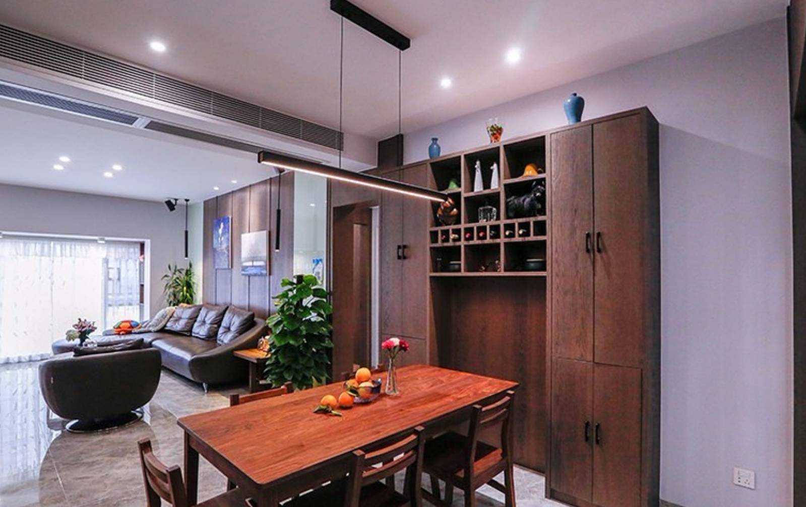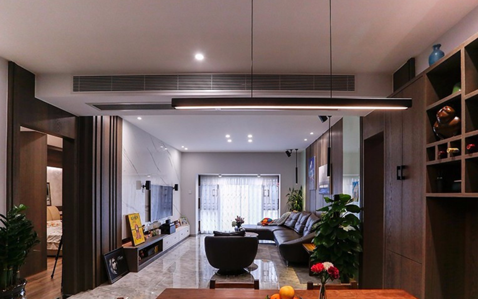 客廳與餐廳互通,中間通過動線過道作區域分割