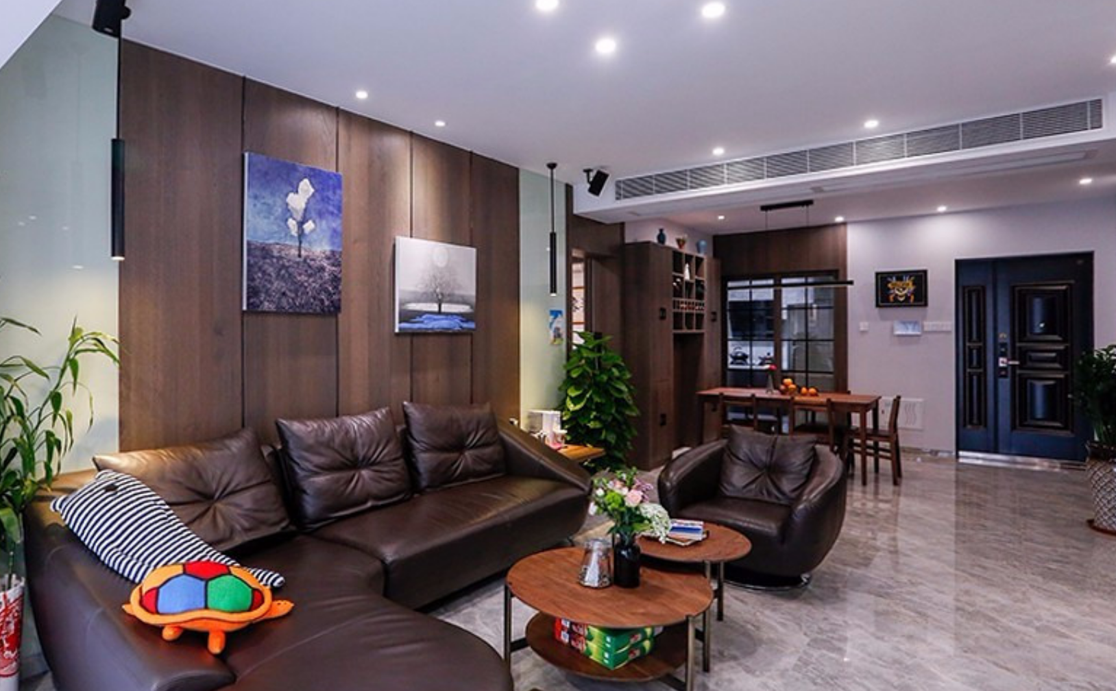 棕色的皮質沙發搭配咖啡色木質紋理護墻板做裝飾,打造愜意之感;兩個黑色的線狀吊燈,纖長的造型成為沙發一角的亮點。