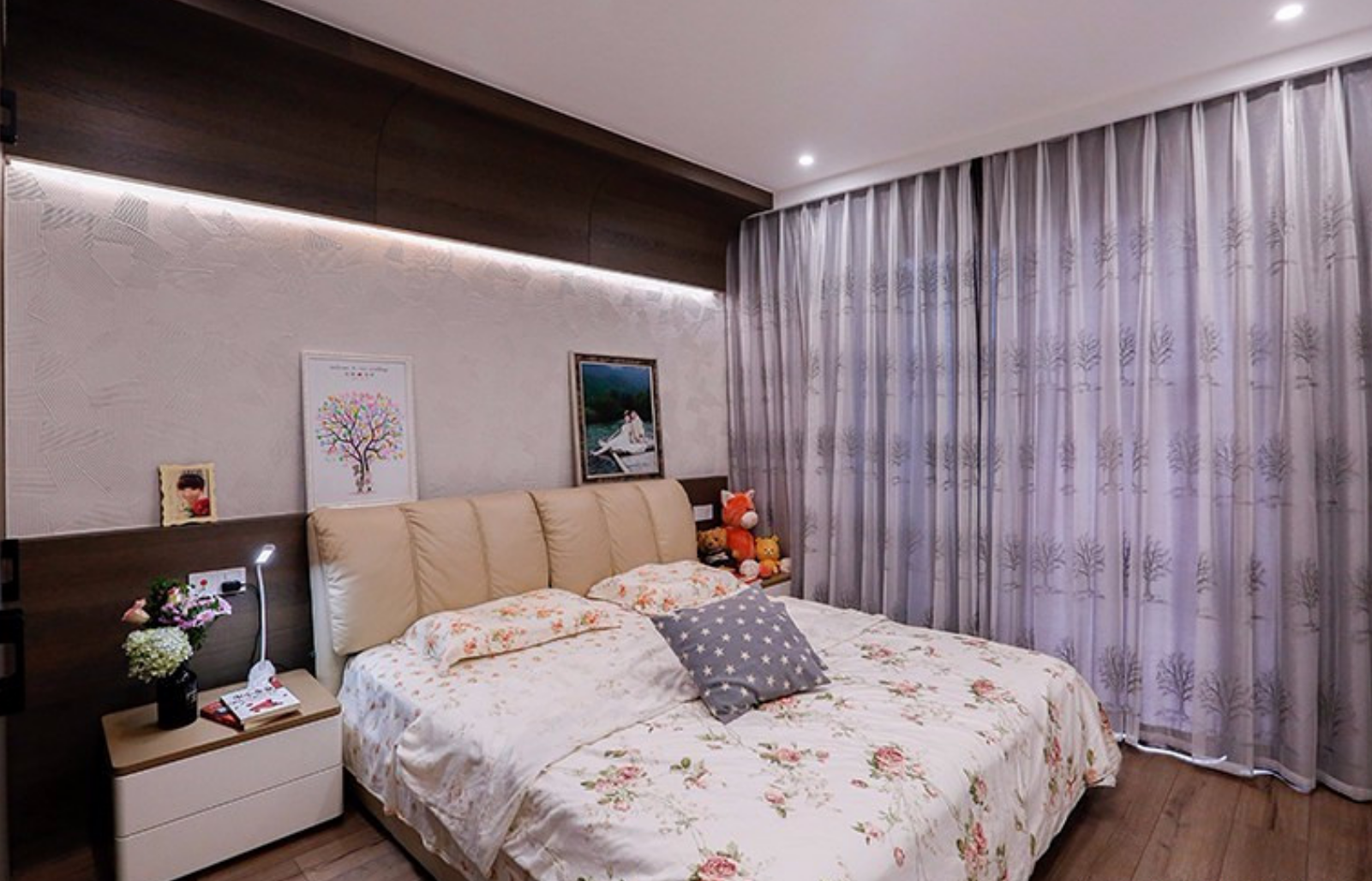 主臥延續著時尚的咖啡色調,搭配米白色的皮質家私,床背景用燈帶洗墻的方式,再裝飾幾幅簡框畫,打造簡約舒適的就寢空間。